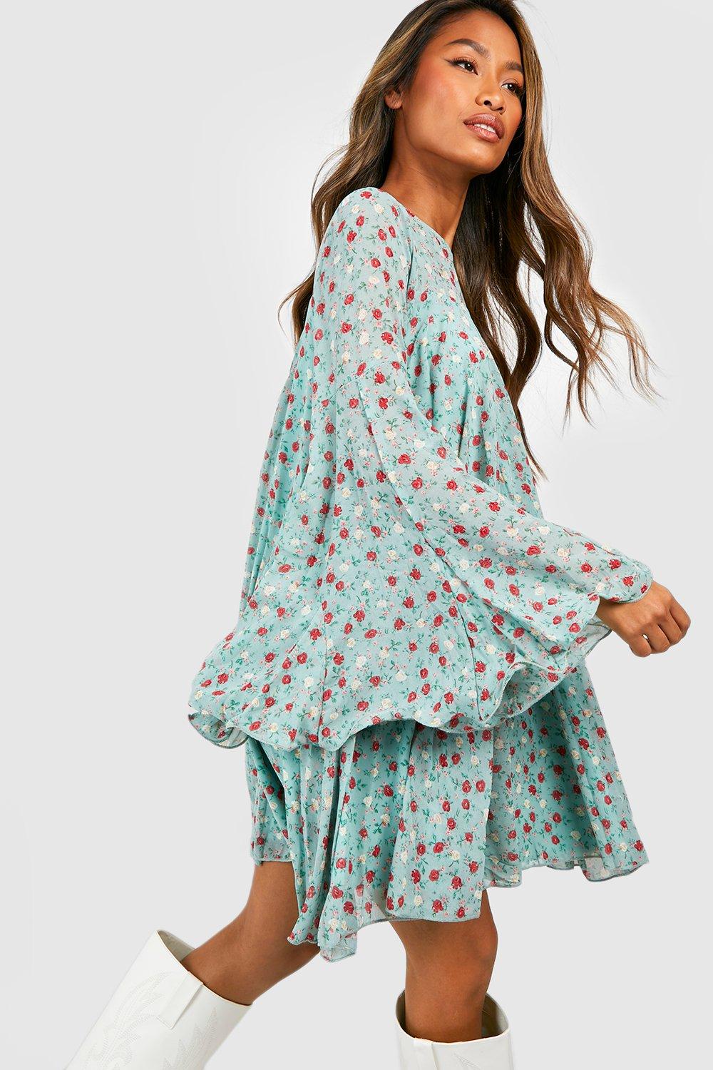Boohoo Women s Floral Print Pleated Detail Smock Dress Blue Very well made.