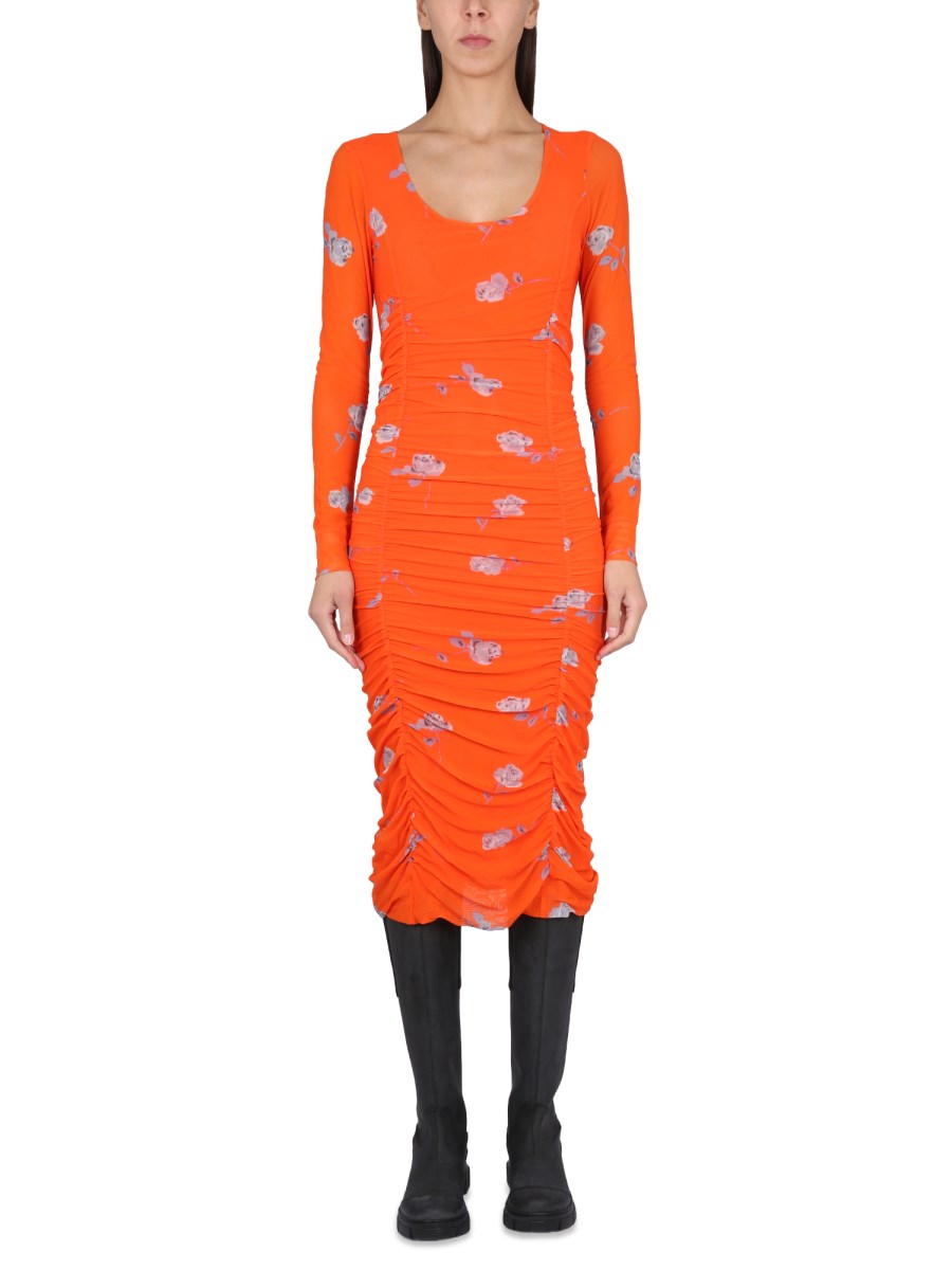 Ganni Ruched Floral print Mesh Midi Dress in Orange Lyst Australia Very well made.
