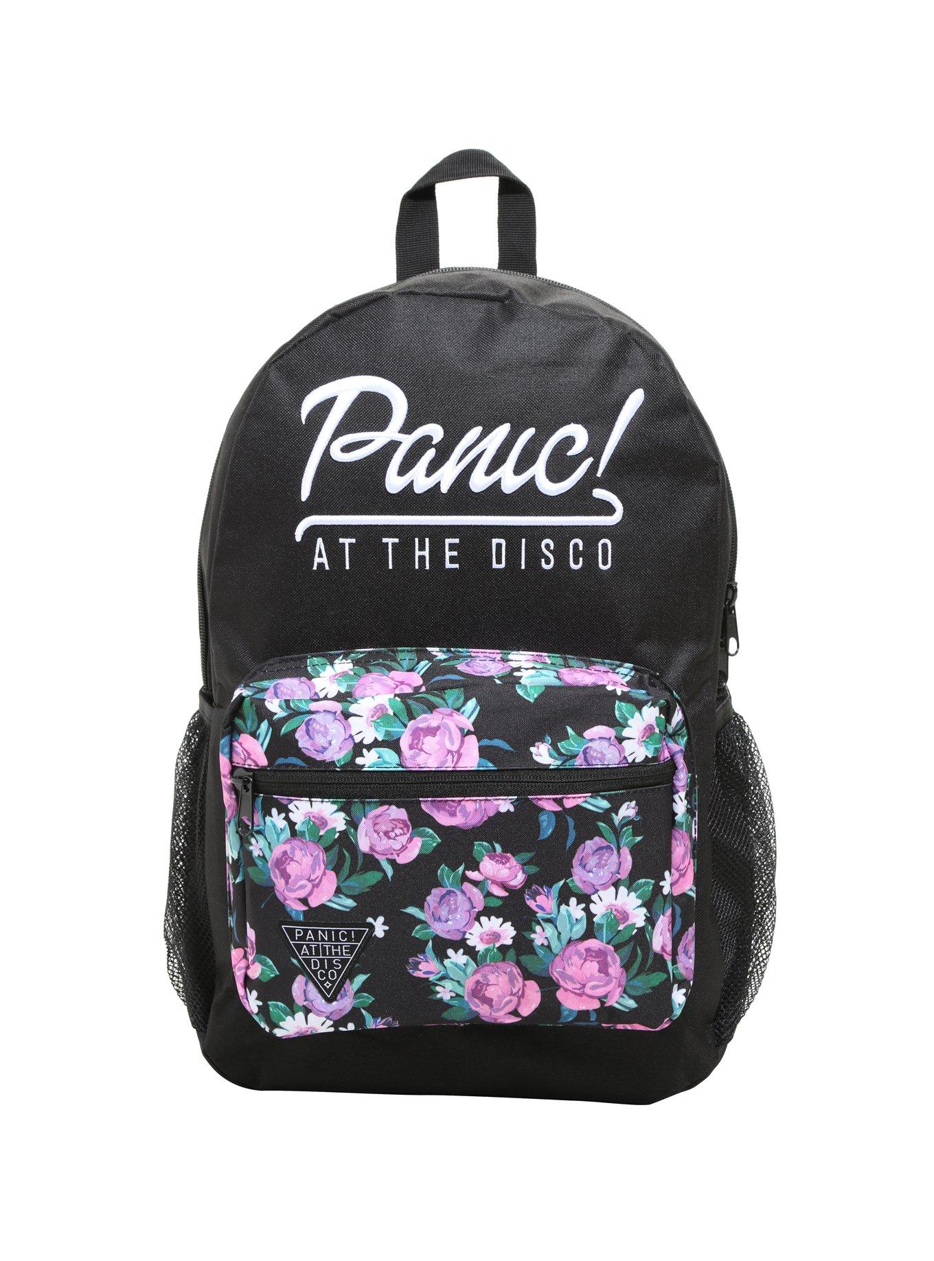 Hot Topic Panic At The Disco Backpack Black Purple White Floral Very well made.