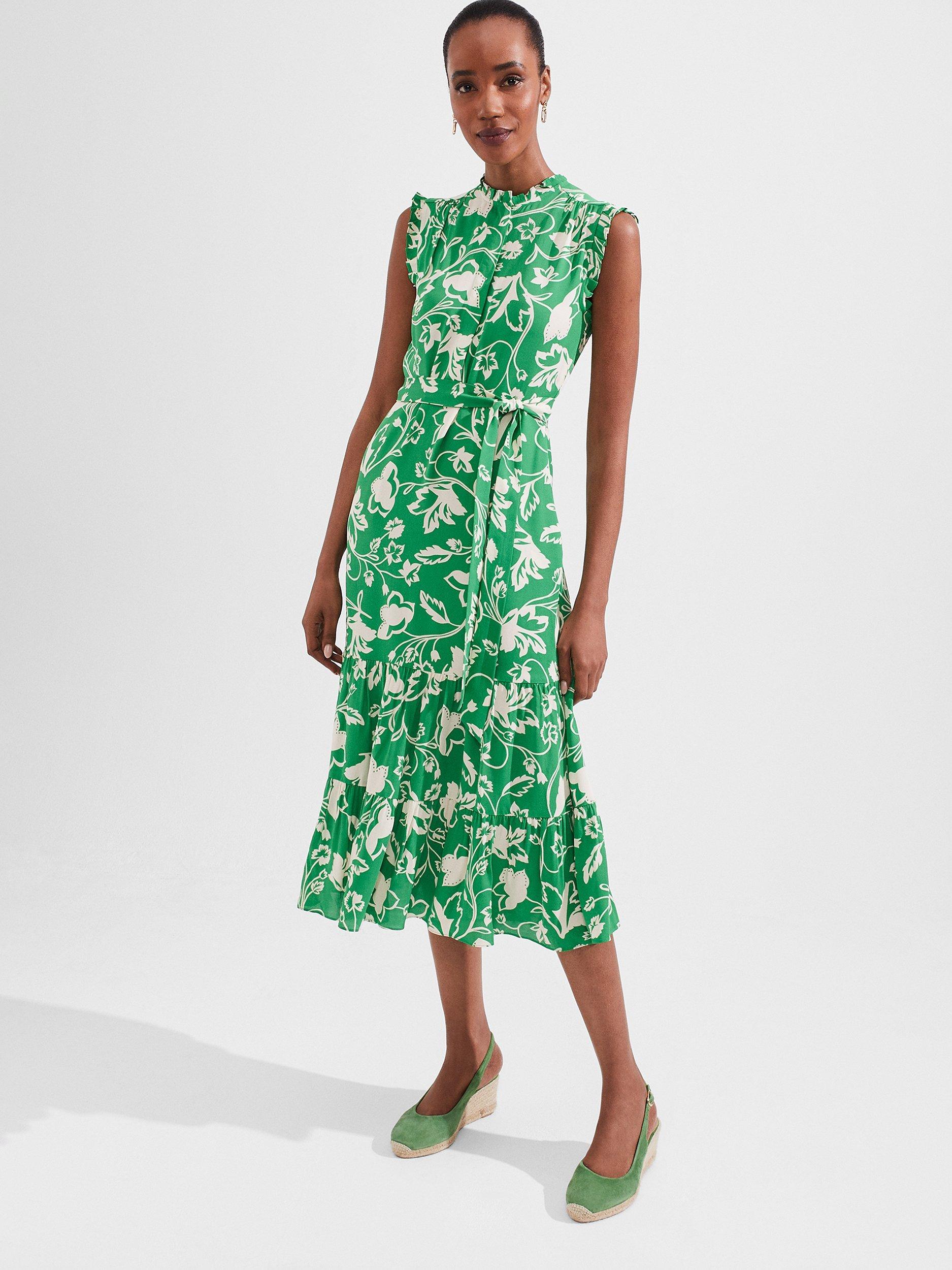 Hobbs Elsa Floral Frill Neck Midi Dress Green Ivory Very well made.