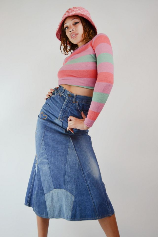 Vintage 1970s Denim Patchwork Maxi Skirt Selected By Old Moon Vintage Free People Very well made.