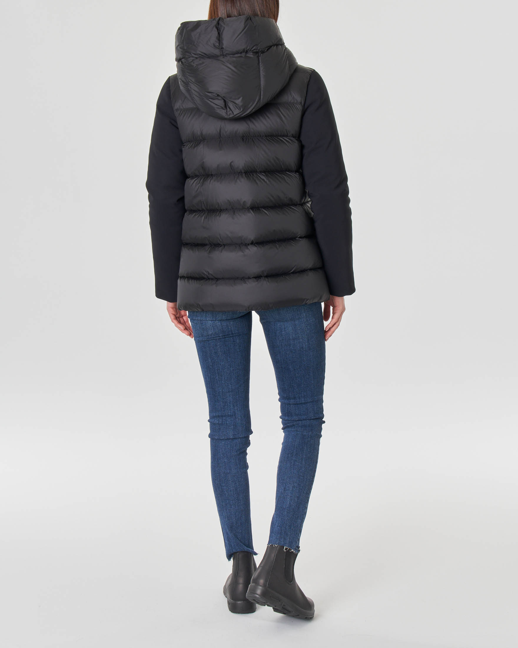 Piumino corto nero con cappuccio e inserti di tessuto liscio Very well made.
