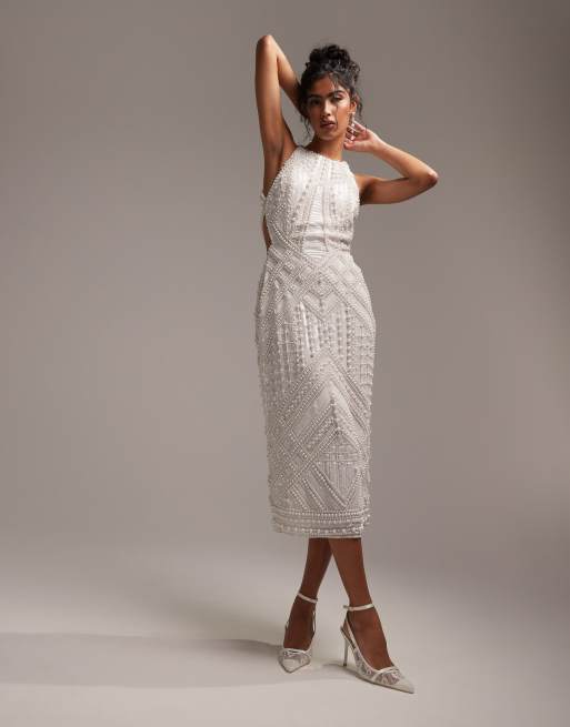 ASOS DESIGN pearl and sequin embellished halter midi dress in ivory Very well made.