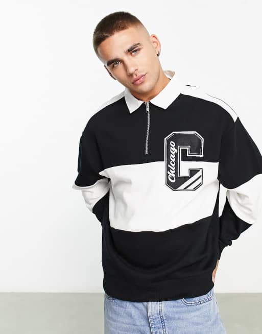 ASOS DESIGN oversized stripe rugby polo with varsity badge in black and white Very well made.