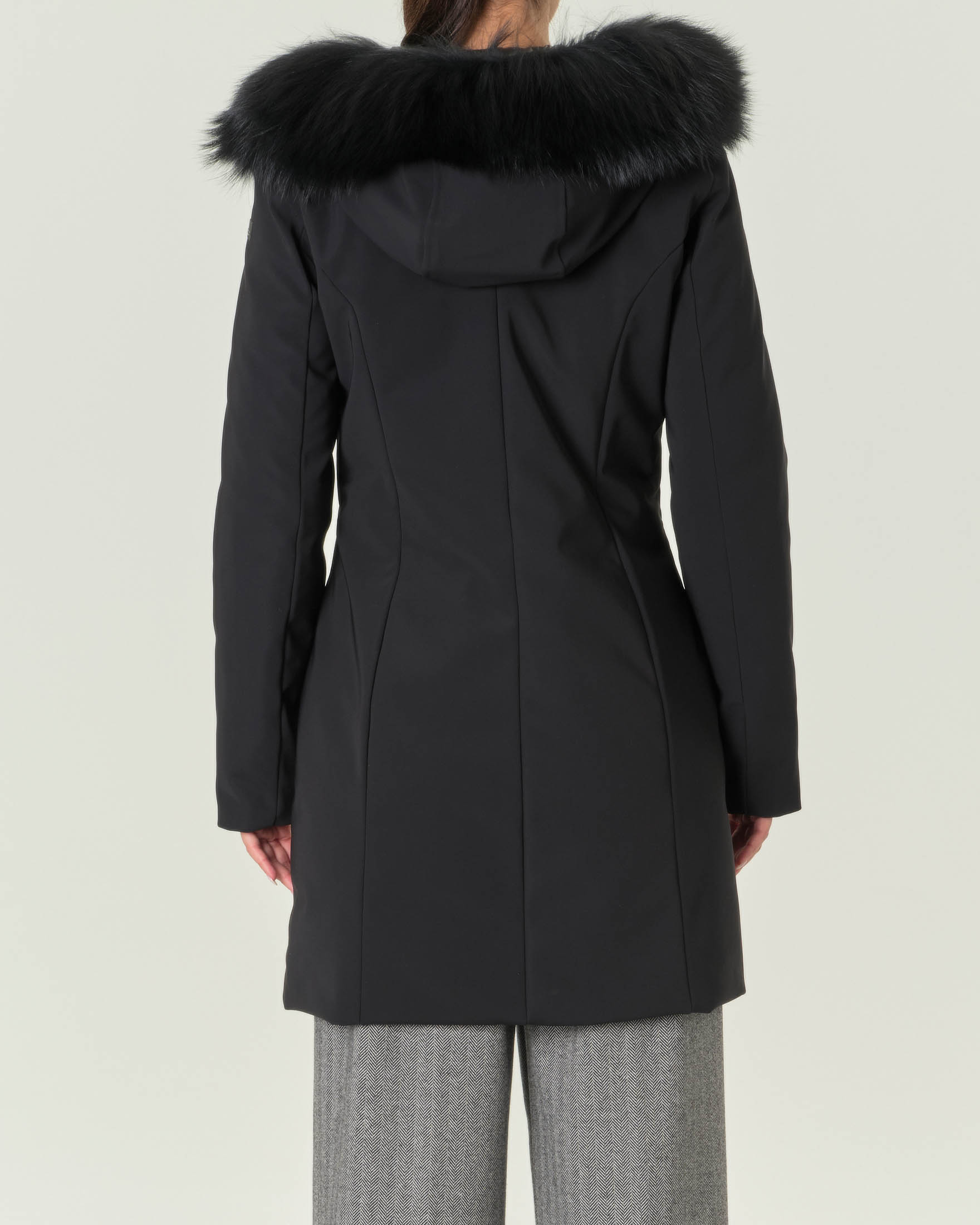 Cappotto nero imbottito Long Lady con profilo removibile in pelliccia lungo il cappuccio fisso Very well made.