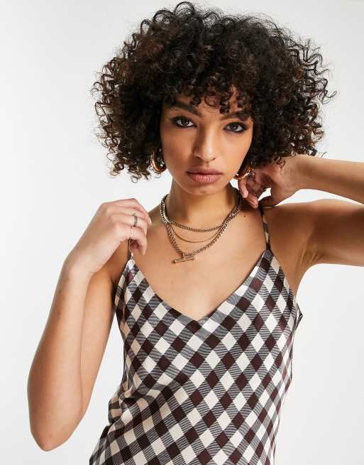 Topshop gingham mini satin slip dress in brown check Very well made.