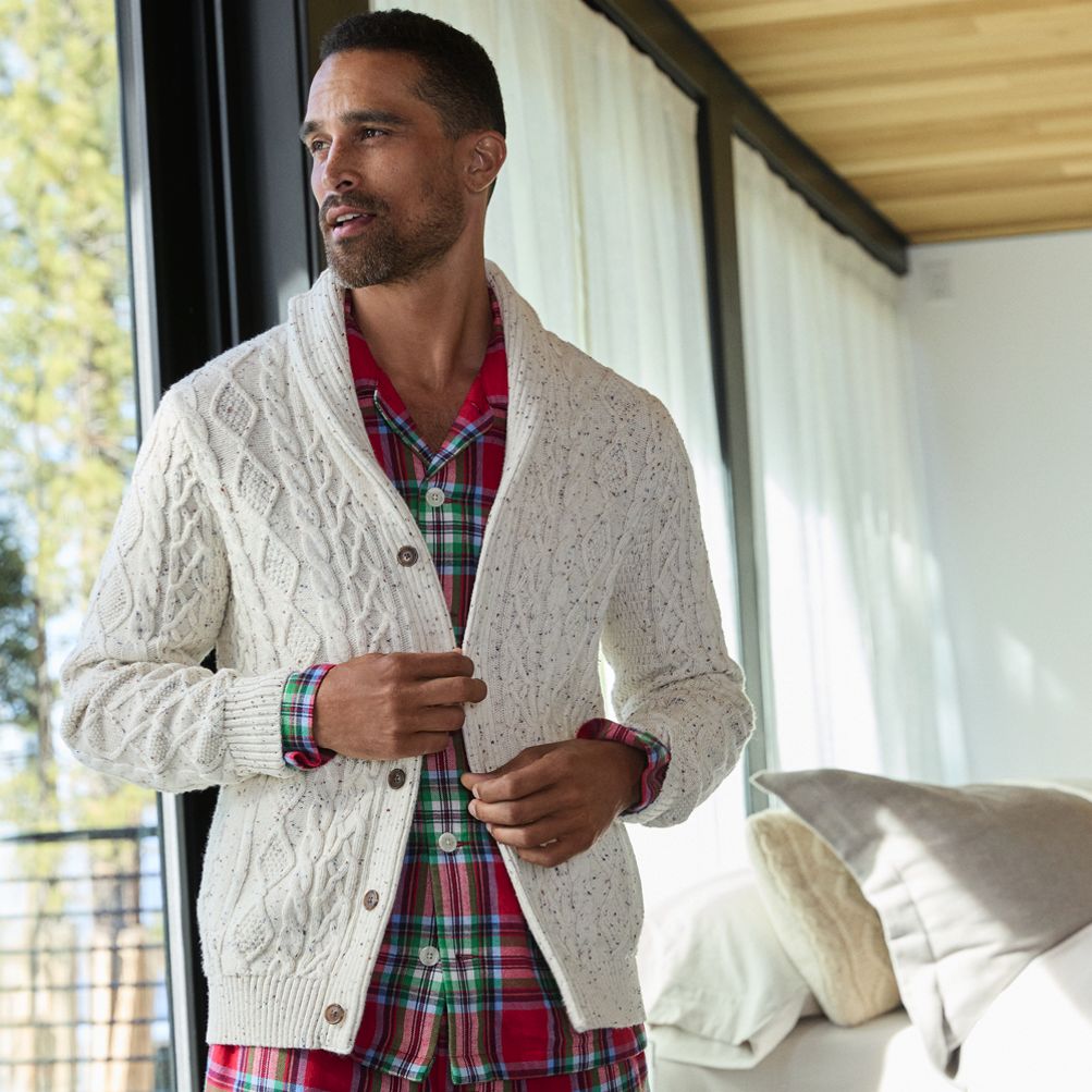 Men s Cotton Blend Cable Shawl Cardigan Sweater Lands End Very well made.