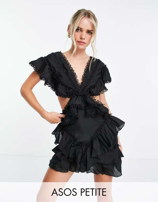 ASOS DESIGN Petite lace trim structured mini dress with ruffle detail in black ASOS Very well made.