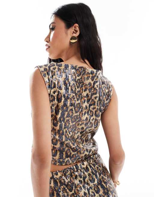 ASOS DESIGN leopard sequin slash neck top in brown part of a set ASOS Very well made.